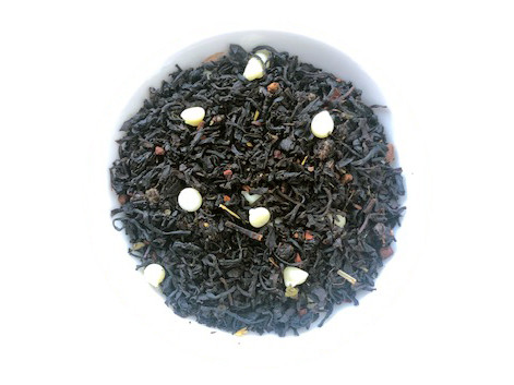 Ingredients: Organic black tea, White chocolate chips (sugar, cocoa butter, milk, skim milk powder, soy lecithin, vanilla), Organic cinnamon, Butterscotch pieces (sugar, butter, chopped almonds, milk, milk chocolate (sugar, milk ingredients, cocoa butter, unsweetened chocolate, lactose, soy lecithin, artificial flavour), salt), Organic nutmeg, Organic stevia, Natural and Artificial flavouring